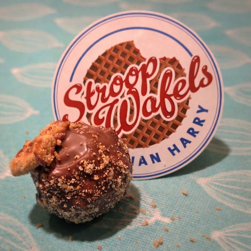 Een romige melkchocoladebonbon gevuld met zachte ganache van stroopwafelstroop, gemaakt met de stukjes van Harry’s Stroopwafels aan de buitenkant.